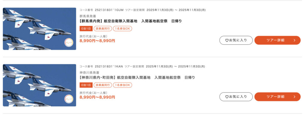 入間基地航空祭はかなりの集客が見込めるので、東京だけでなく、関東の様々なところから発着で日帰りのバスツアーが読売旅行から企画されています。